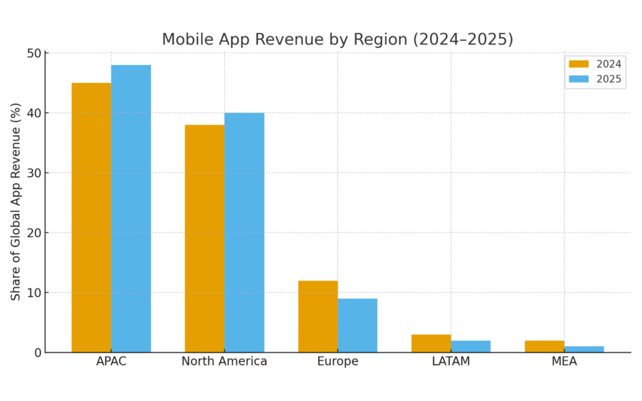 Regional revenue patterns differ: APAC leads in downloads, North America in revenue.