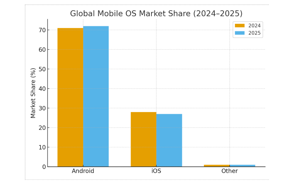 Android holds the global majority; iOS dominates premium segments and the U.S. market.