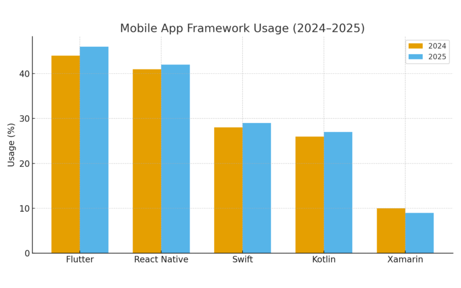 Cross-platform frameworks continue to rise for speed and code reuse; native stacks remain the go-to for high-performance and hardware-heavy features.